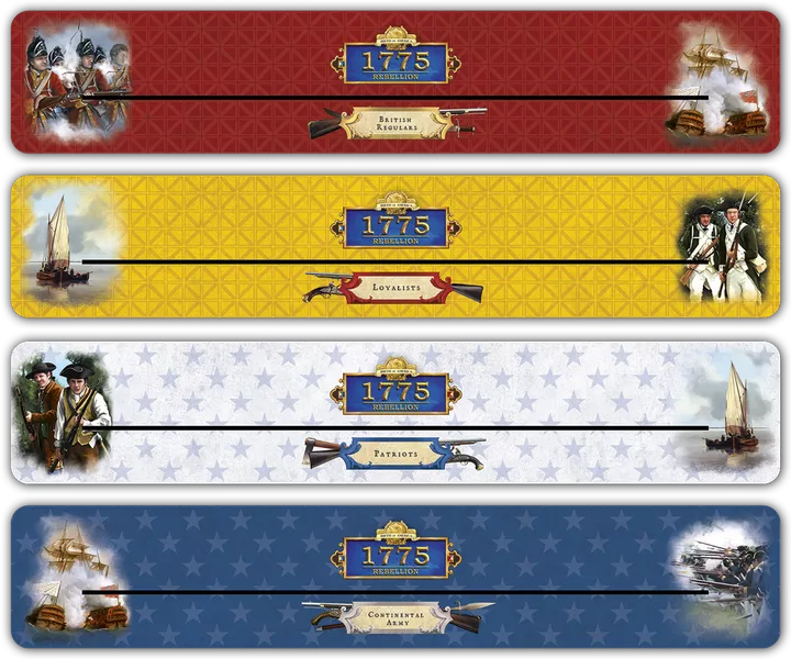 A set of four card holders for 1775: Rebellion. Described as wooden but actually made of thick, stiff pressboard.