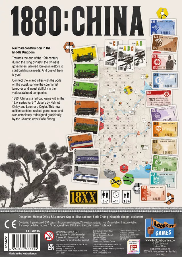 In 1880: China, based on 1829 by Francis Tresham, the players become railway barons in the far east, experiencing China's railway history in a game that was designed to represent related historical events as correctly as possible within its own game mechanisms. Being a classic 18xx game, the players compete to become the richest. In order to gain money, they buy and sell shares of China's historical railway companies, build and expand their railway network, and let trains travel on the networks. Shares of successful companies are worth more, and owning them will increase the chance to win the game. In the end, the player with the highest wealth combined from cash and shares wins.