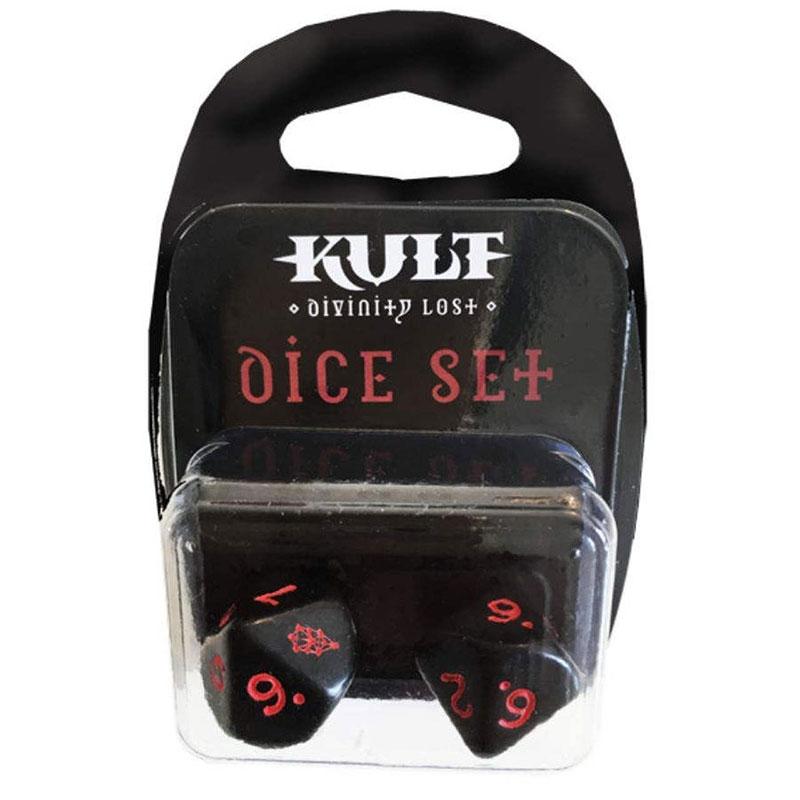 The Dice Set for KULT: Divinity Lost consists of two custom-made d10, with the number 1 replaced by the Sephirot symbol, in black and blood red.