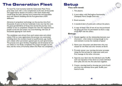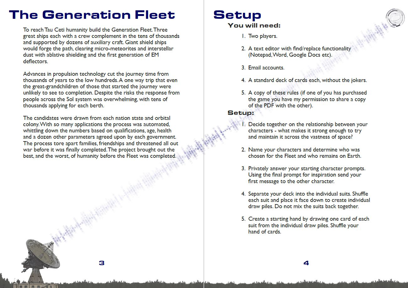 One player takes on the role of the Explorer, one of the lucky few chosen to join the generation ship while the other takes on the role of the Earther, forced to stay behind as their companion departs the solar system. Play each round is driven by a series of prompts, a combination of mundane everyday occurrences and life-changing events that develop over time. Sending messages back and forth to one another the players must try to maintain a connection in the face of an ever-increasing time lag and the creeping distortion of the messages as the signal becomes distorted during its transmission over interstellar distances. Eventually, the unfolding events or slow loss of connection will force one to break contact, forever severing the bond between the characters that they have struggled to maintain for so long.