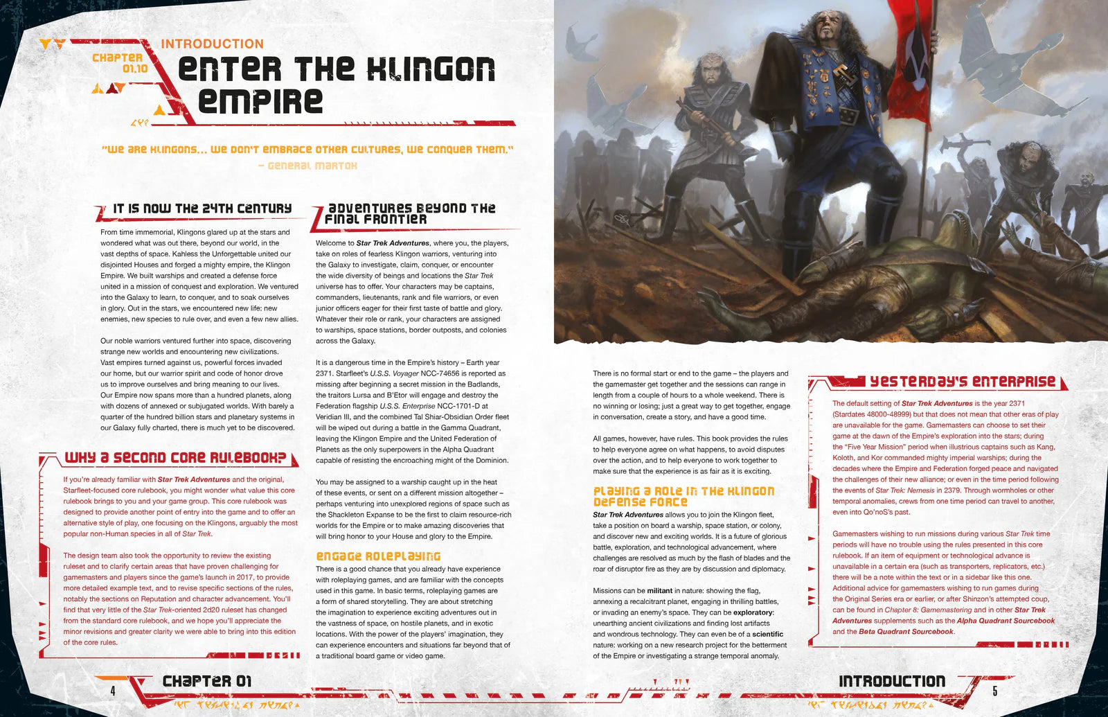 THE KLINGON EMPIRE core rulebook for the Star Trek Adventures Roleplaying Game takes you to the Final Frontier of the Galaxy, where new worlds and new civilizations await bold Klingon warriors hungry for glory and honor. Your duties may take you to the edges of known space, to Klingon colonies in need, to the borders of neighboring galactic powers, or into the eye of interstellar phenomena. Your warship and crew represent the best-trained and most honorable of Klingon warriors, and your cunning and abilities are needed now more than ever.