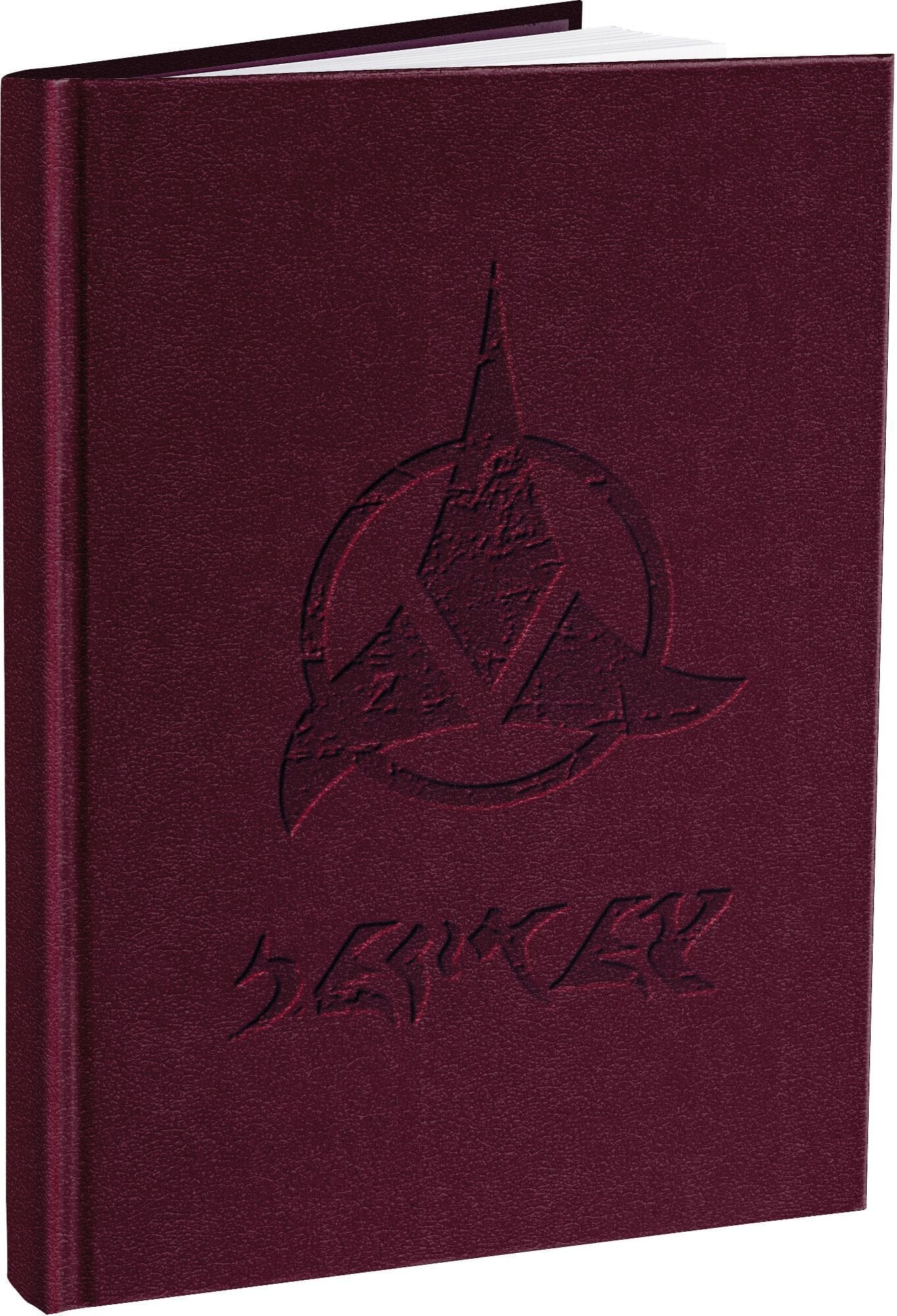This collector's edition of the 400 page full color hardback Star Trek Adventures core rulebook is bound in a beautiful vinyl leatherette cover, stamped with the Klingon Empire insignia, and contains: