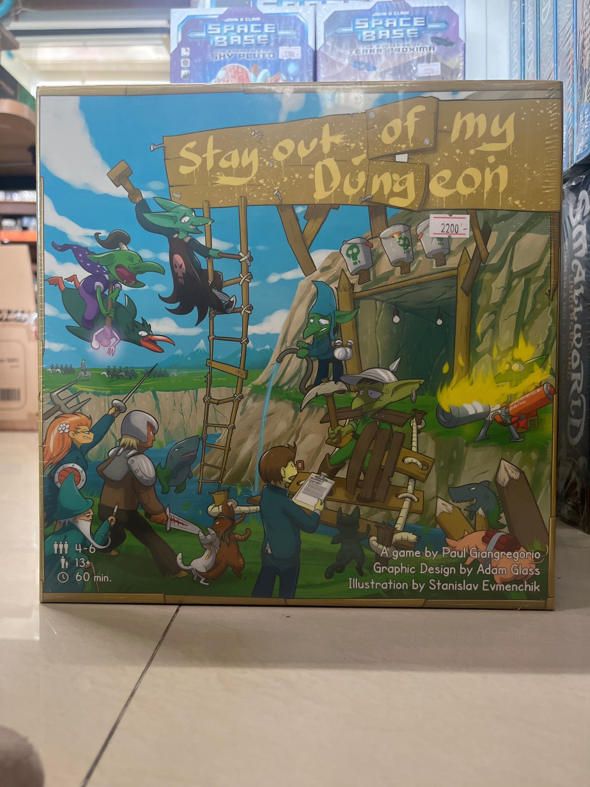 In Stay Out of My Dungeon! players take on the role of goblins trying to defend their dungeon from the greedy king Flumperdump. Each player, playing as 1 of 7 unique goblins, takes turns visiting and building various locations in and around their dungeon. From flame throwing turrets, to sharkodile moats, to poison traps, players must work semi-cooperatively to build each location to perfection before the King's royal guard shows up.