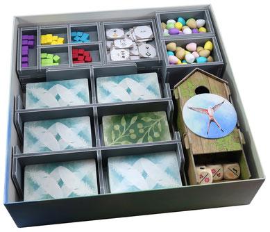 Insert compatible with Wingspan®, and the European® and Oceania® expansions. The design provides both efficient storage and improved game play. Many of the trays can be utilised during the game, and they greatly aid set-up and clear-away times. The rules and boards act as a lid on top of the trays.